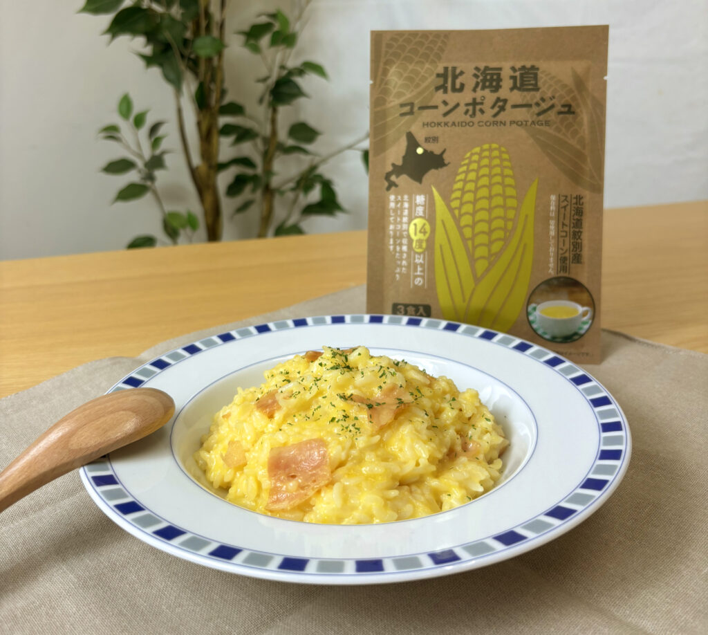 北海道産とうもろこしの甘さをぎゅっと閉じ込めた「北海道コーンポタージュ」。このやさしい味わいをもっと楽しんでもらえる方法はないかと考え、今回“コーンポタージュリゾット”を作りました。